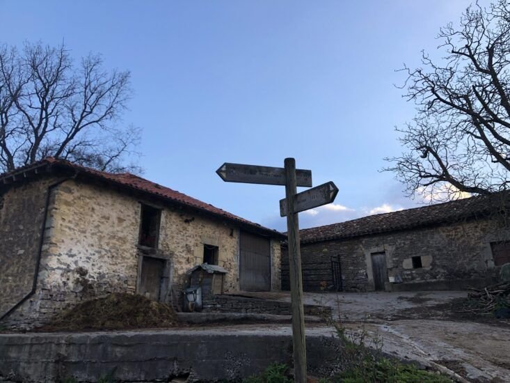 En este pequeño pueblo tomaremos una pista en la cual parece que nos metemos en una propiedad privada pero no es así, en realidad pone camino con veis en la foto y por aquí continuaremos hasta Artziniega.